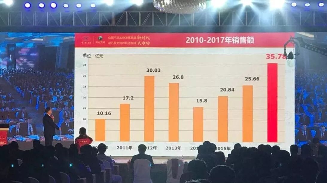他在讲话中提到,2017年全年销售额达35.78亿(超过2012年最高峰30.03亿元),同比增长约39.4%。“习酒窖藏1988”突破十亿大关,同比增长73%,各业务板块均大幅超额完成任务,电商公司增长比例最高,完成目标任务的279.56%。